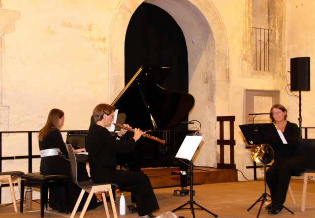 Die drei Musikerinnen Heidi Maier (Horn), Katja Prischmann-Zima (Oboe) und Marharyta Ushakova (Klavier), die Stücke zu den Ereignissen im November 1938 zusammengestellt hatten, spielten zum Beispiel das jüdische Gebetslied „Kol Nidre“, Werke von Robert Kahn (Serenade f-moll für Oboe und Klavier), Charles Koechlin und Peter Jona Korn, der sich von Eduard Mörikes Gedicht „Bei Nacht im Dorf der Wächter rief“ inspirieren ließ. Dazu Lieder der Sinti und Roma, melancholisch, beklemmend, auch mitreißend und schwungvolle jiddische Tänze. Sylvia Jansen sorgt mit den kurzen Texten von Georg Herzberg, Joseph Henri da la Teyssionnière, Amalie Schaich und Halina Birenbaum zwischen den Musikstücken für eine dichte, bewegende Einheit. „Die Schornsteine qualmten Tag und Nacht…Wenn der Wind den Rauch zu uns trieb, war es kaum er ertragen, so fürchterlich war der Gestank…halbverbrannte Menschenleichen waren wie Holzscheite auf einem Haufen zusammengelegt“ (Erinnerungen Amalie Schaich).